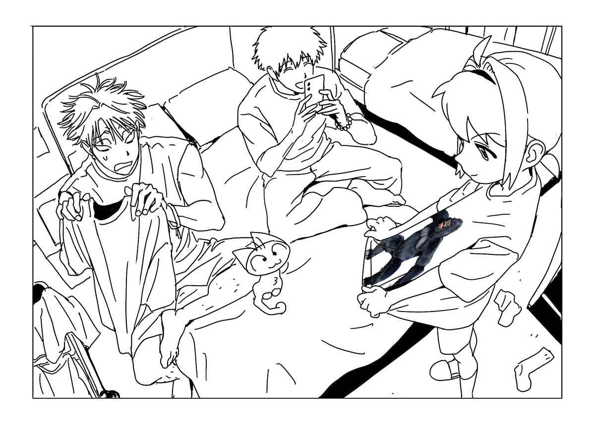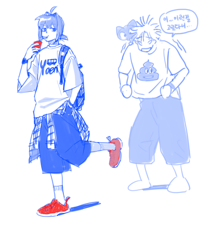 상황: 여행에 갔는데 연주가 잠옷을 안 가지고 왔다. 량이랑 동행이가 각자 반팔티를 보여주고 골라서 입으라고 했다. 연주는... 동행이의 고릴라 티를 골랐다. 입고 편의점도 갔다. 량은 어이가 없다.