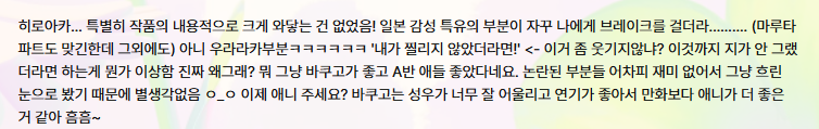 어릴 땐 가끔 스트레스 받으면 학원에서 집 오는 길에 아무도 없는 밤거리를 마구 뛰고 그랬다. 달리기엔 참 별 기억이 다 있구만~... 달리기하면,... 고미야가 말한 것처럼 뛰는 동안은 다른 생각이 안드니까 좋은 것 같아.... 전력으로 달리는 기분은 정말 좋아. 내일도 운동하면 이 생각하면서 쪼끔 열심히 뛰어봐야겠따.